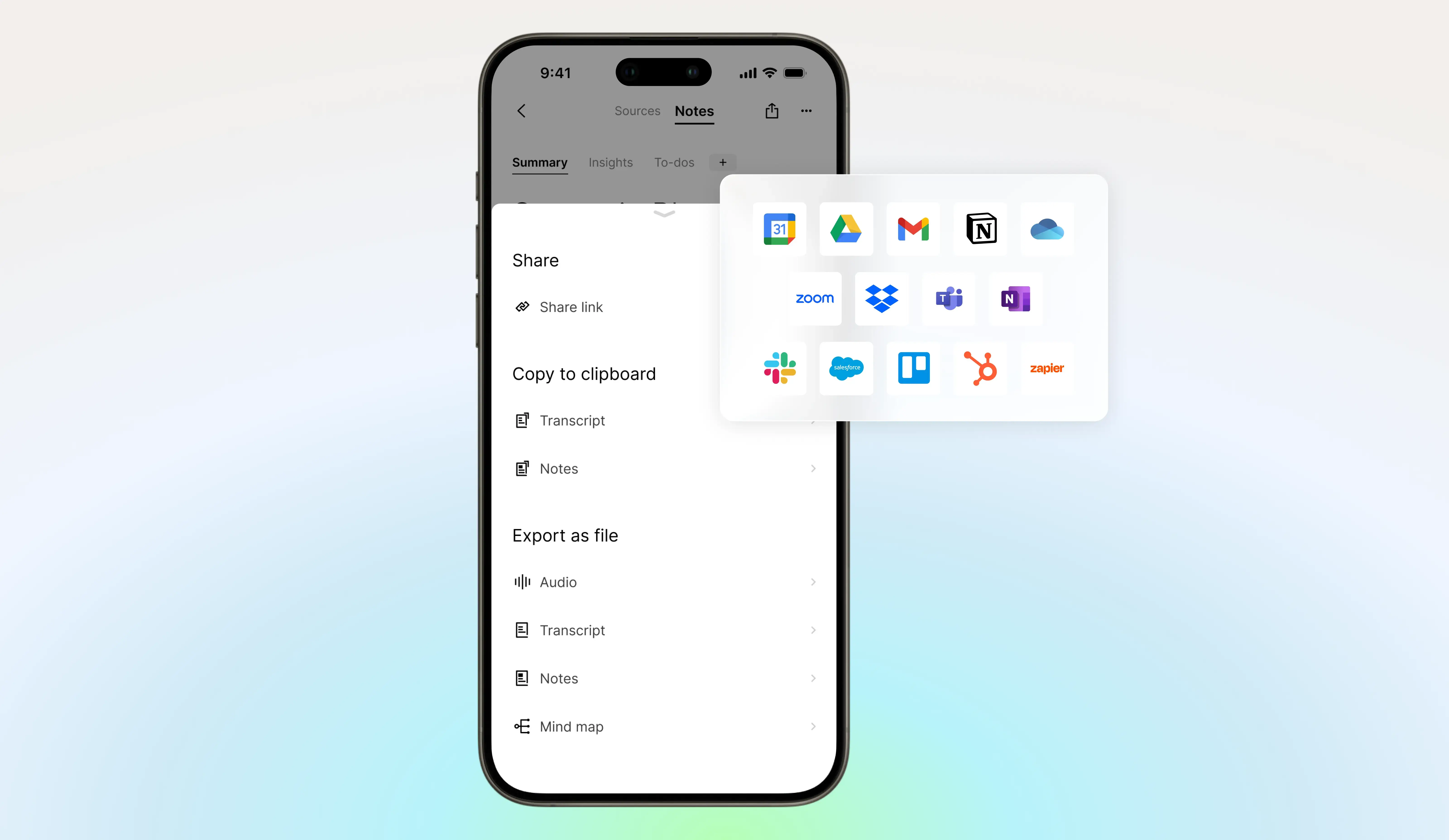 Export recordings, transcripts, summaries, and mind maps with complete control over what you keep and share. Share files in just a few clicks, with support for more than 27 formats.