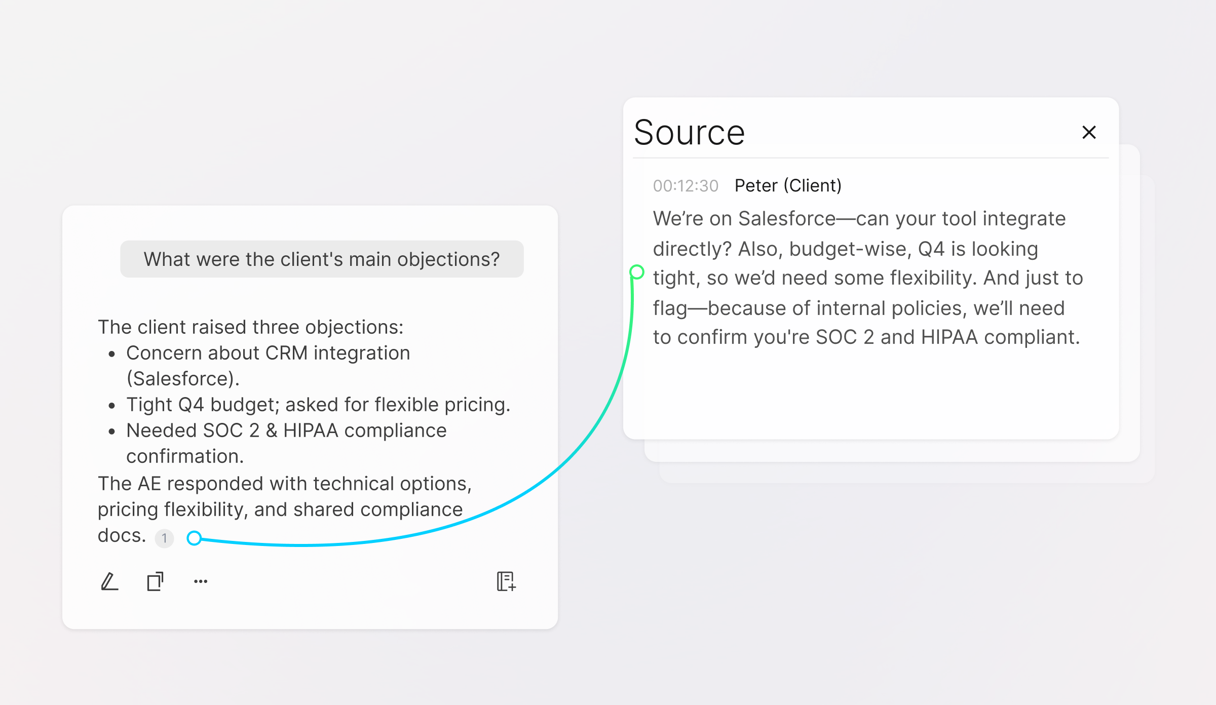 Get instant summaries of your prospect’s history, CRM interactions, and prior notes so you walk in prepared and confident.