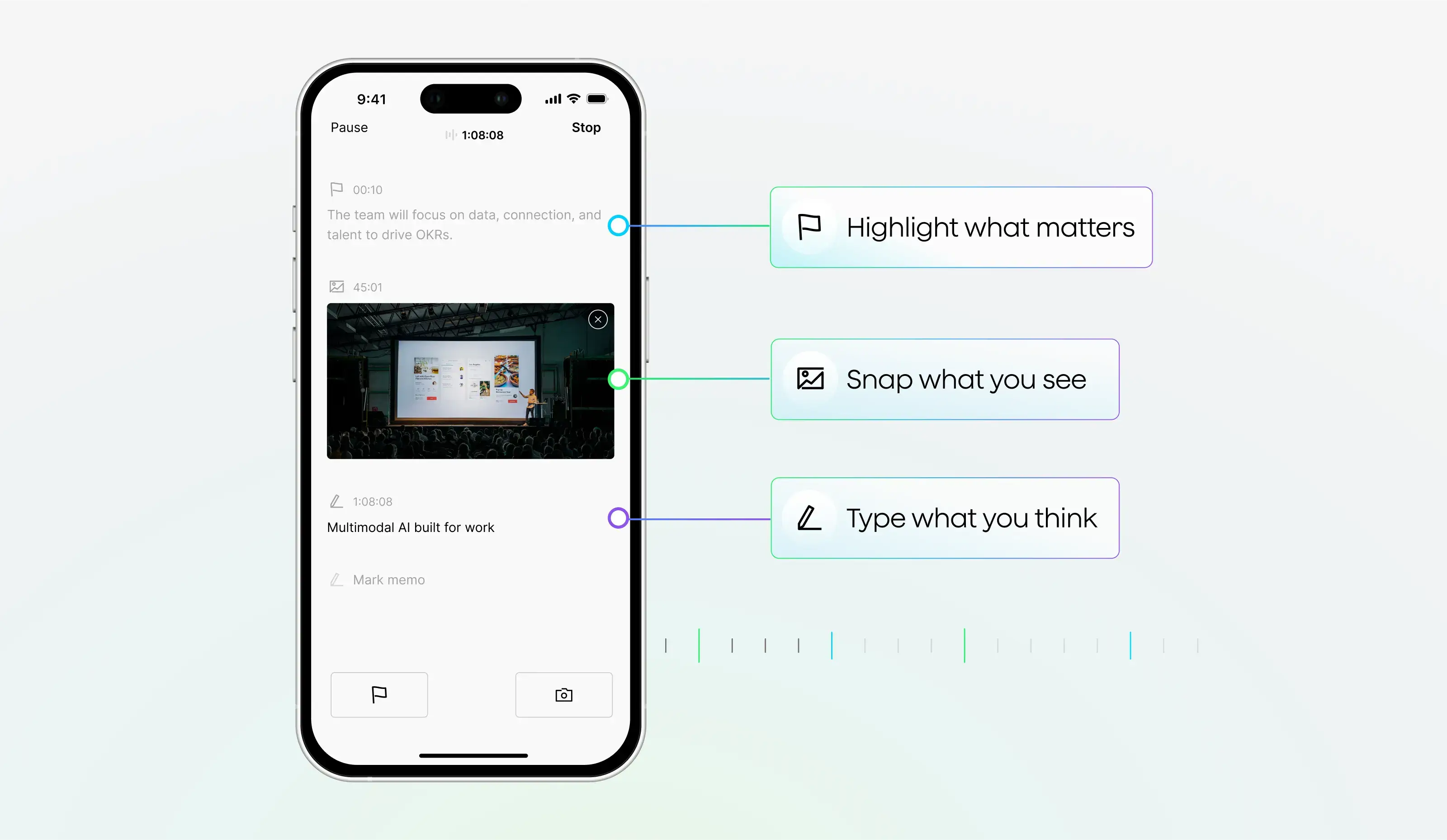 On Plaud Note Taker, long-press to record or short-press to capture key moments and ideas. In the Plaud app, add quick notes and snap images for context. Plaud brings every input together into multidimensional summaries, giving you richer context and clearer insights.
