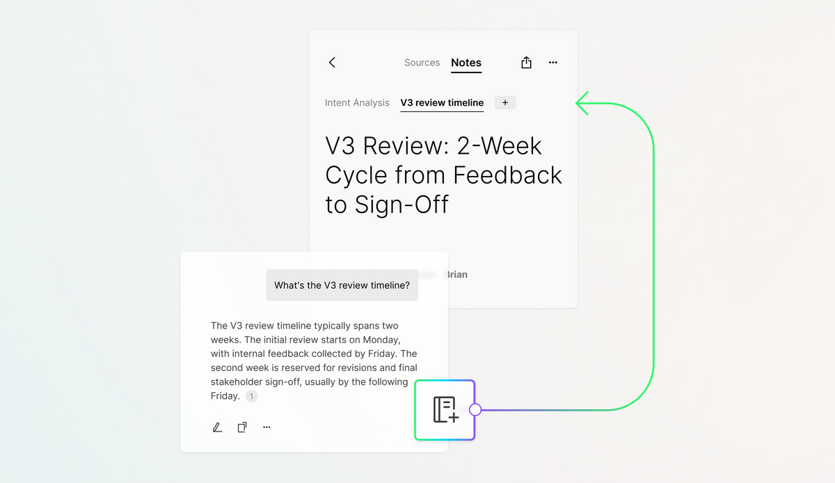 Each one is saved as a note with full context and always accessible, so you can return anytime, build on the same thread with new questions, and let your insights grow continuously.